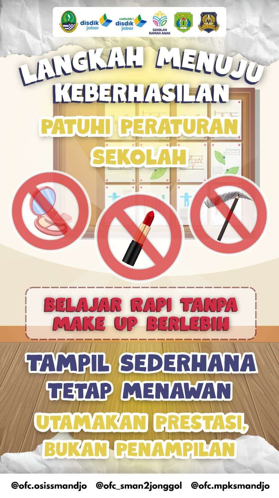 Berdasarkan informasi dari banner di atas, sekolah mau mengingatkan kembali nih soal aturan berpenampilan. Sekolah itu tempat belajar, jadi yuk kita biasakan tampil natural dan sederhana. Percaya deh, kalian udah cantik dan tampan kok tanpa perlu dandan berlebihan!